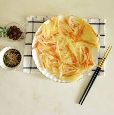 감자는 껍질을 벗기고 얇고 일정하게 채썰어 주세요. 감자채는 너무 두꺼우면 익는 데 오래 걸리므로 얇게 썰수록 좋아요.