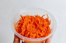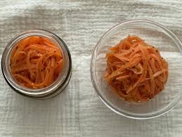 당근은 껍질을 벗기고 얇고 가늘게 채썰거나 채칼을 사용해 준비합니다. 너무 굵으면 식감이 덜해요.
