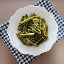 끓는 물에 소금 1/2큰술을 넣고 마늘쫑을 30초~1분 정도 살짝 데쳐주세요. 찬물에 헹궈 색을 살리고 아삭한 식감을 유지해요.