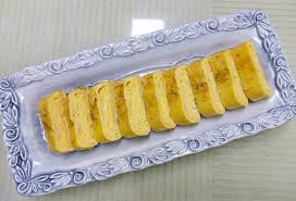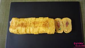 말아낸 계란을 팬 위에 잠시 더 익히고 도마에 올려 김이 빠질 때까지 잠깐 식힌 후 칼로 도톰하게 썰어줍니다