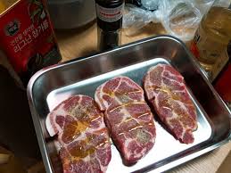 다진 마늘 1작은술, 간장 2큰술, 설탕 1큰술, 맛술 1큰술, 후추 약간으로 재워두면 달달한 양념 목살 스테이크도 만들 수 있어요!