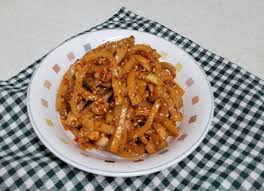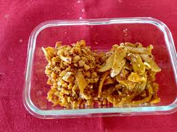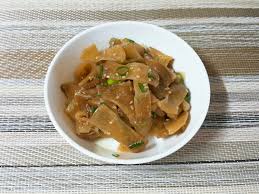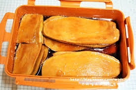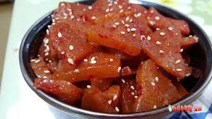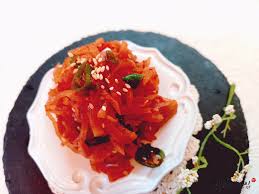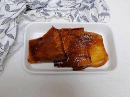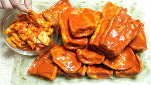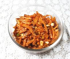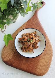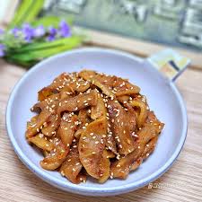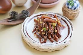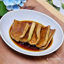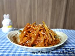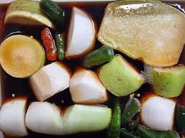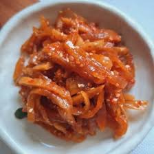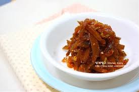 1) 무를 썰어 소금에 절이고 간장, 식초, 설탕으로 만든 장물에 절여 숙성한 밑반찬