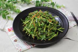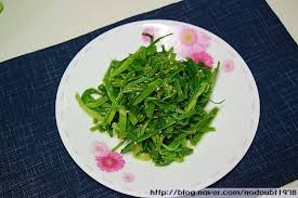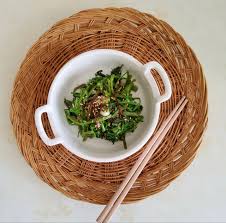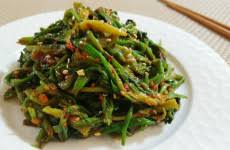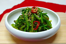 1) 살짝 데친 미나리를 고춧가루, 식초, 간장, 참기름 등으로 새콤달콤하게 무쳐내는 나물 반찬