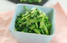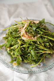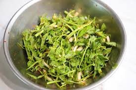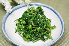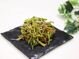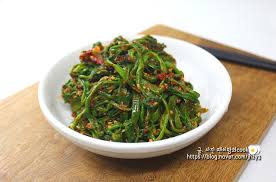 1) 살짝 데친 미나리를 고춧가루, 식초, 간장, 참기름 등으로 새콤달콤하게 무쳐내는 나물 반찬