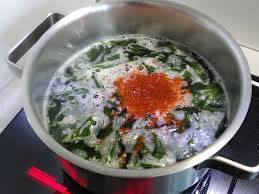 물 또는 멸치육수 5컵을 붓고 끓기 시작하면 된장을 체에 풀고 다진 마늘을 넣습니다.