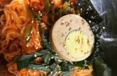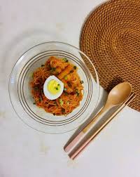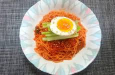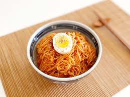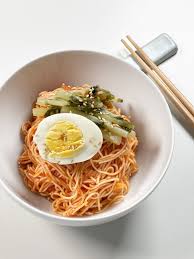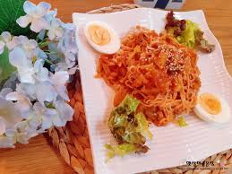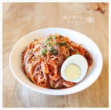 1) 삶은 소면에 매콤달콤한 고추장 양념장을 넣어 비벼 먹는 별미 국수