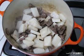 무를 넣고 3분 정도 더 볶아 고기 맛이 배도록 합니다.
