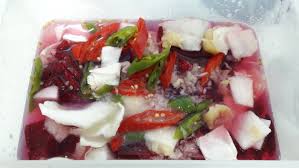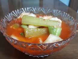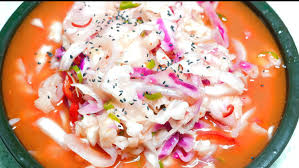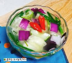 1) 아삭한 양배추와 무, 파프리카 등을 새콤달콤하게 절여 시원한 국물에 담근 물김치