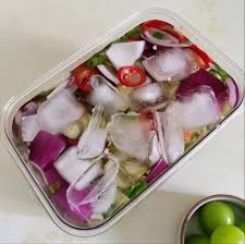 썰어둔 오이지와 채소들을 넣고 섞은 후, 마지막에 얼음 몇 조각을 띄워 시원하게 완성! 깨소금 톡톡 뿌리면 끝!