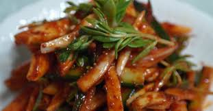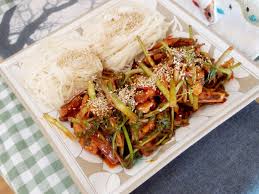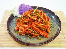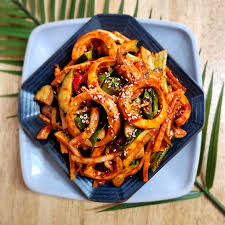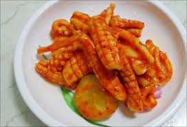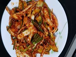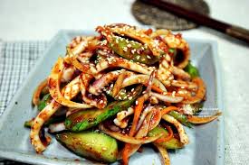 오징어는 내장을 제거하고 껍질을 벗긴 후 깨끗이 씻어 몸통은 링 모양으로, 다리는 먹기 좋게 썰어주세요 끓는 물에 소금과 식초를 약간 넣고 오징어를 30초~1분간 데쳐낸 후 찬물에 헹궈 탄력을 살리고 물기를 제거해줍니다